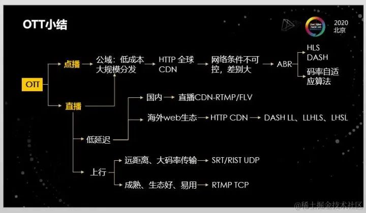 OTT个人直播体验,还有一个非常重要的点就是上行推流的稳定性,因为一旦推流质量不好,全网的观看质量都会下降。目前推流协议主要有三类:分别是RTMP、SRT和RIST,其中RTMP是主流,优势是:成熟、稳定、生态好,各类编码工具基本都支持。SRT和RIST是基于UDP传输,主要优势是:长距离传输(例如:跨洋)、大码率传输、弱网传输。另外相较于TCP层的拥塞算法优化,SRT和RIST可以在应用层优化传输算法,更新比较方便。一些大型跨洋直播的第一公里推流会使用这类协议。