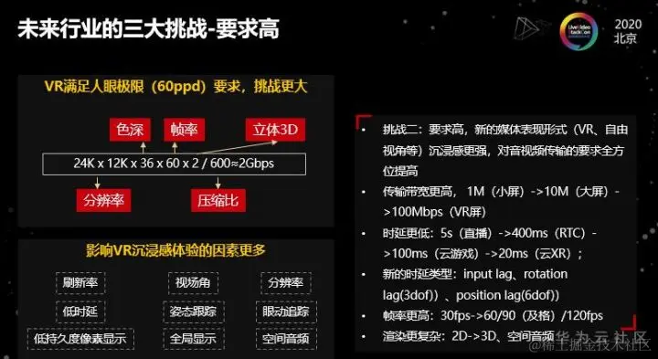 第二要求高。新的媒体表现形式沉浸感更强,对音视频传输的要求更高。而且这种提高是全方位的,主要包括: