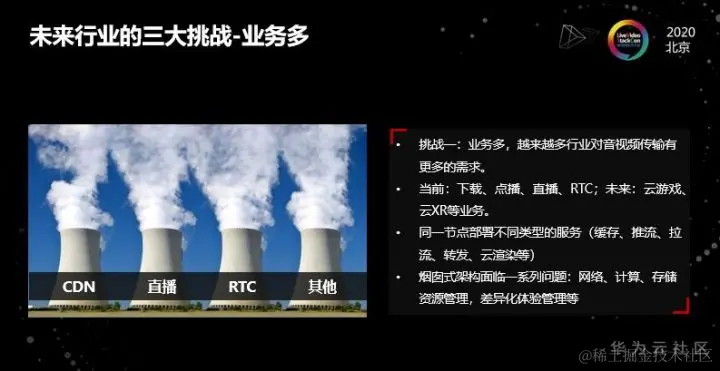 第一业务多。边缘业务类型越来越多,从现在已经成熟的下载、点播、直播、RTC,在到正在快速发展的云游戏、云XR等;同一节点部署不同类型的服务,包括缓存、推流、拉流、转发、云渲染等;而烟囱式架构面临一系列问题:包括网络、计算、存储资源管理、差异化体验管理等。