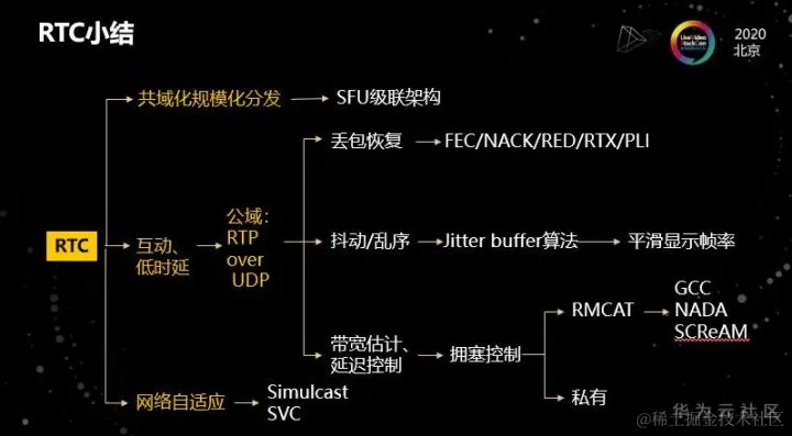 RMCAT是一个IETF小组;他们的工作内容包括:定义需求;设计基于RTP的实时流媒体协议传输的拥塞控制算法。目前有三种RMCAT算法包括:GCC、NADA和SCReAM。其中GCC因为应用在Chrome浏览器上,是目前比较成熟的算法。包括GCC-REMB和新版本GCC-TFB。新版本的优势是:由一端来控制算法,有利于版本演进,同时发端可以根据内容属性的不同,分配不同的带宽进行传输,更加灵活。