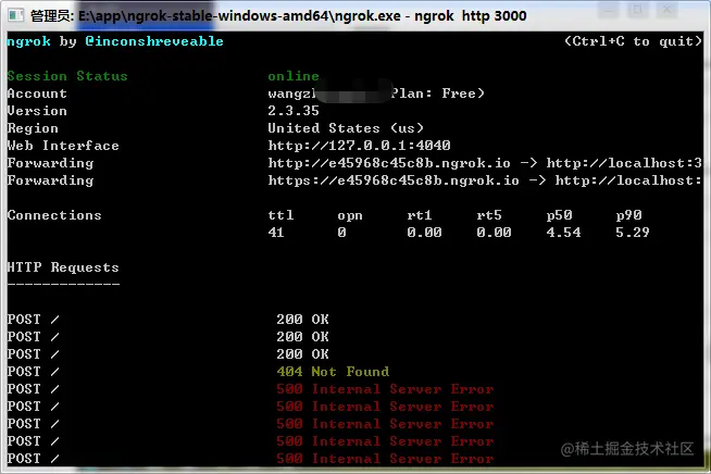 Forwarding,第一个是http协议对应的外网地址,第二个是https协议对应的外网地址。这样,凡是访问e45968c45c8b.ngrok.io的请求都将发送到localhost:3000。