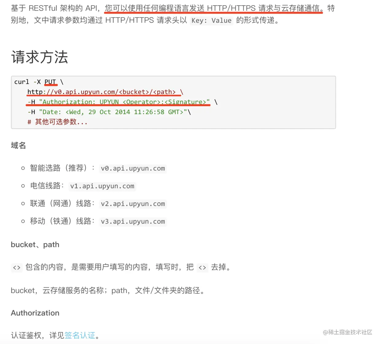 通过文档介绍,我们可以看到如果需要请求云存储的上传接口,我们需要使用 PUT 的方式,向 v0.api.upyun.com 发起请求。其中存储服务名和文件的保存路径定义在请求地址中。并且需要携带 Authorization 鉴权请求头,来确保 API 的调用是合法的。