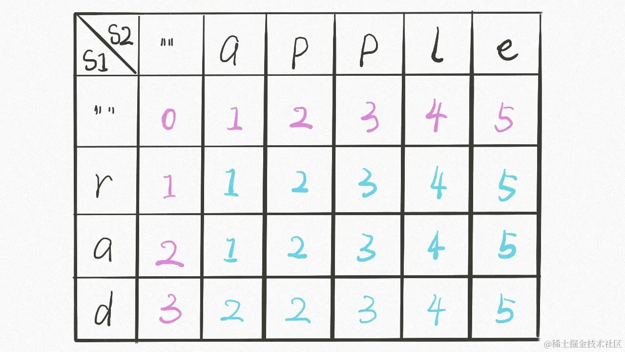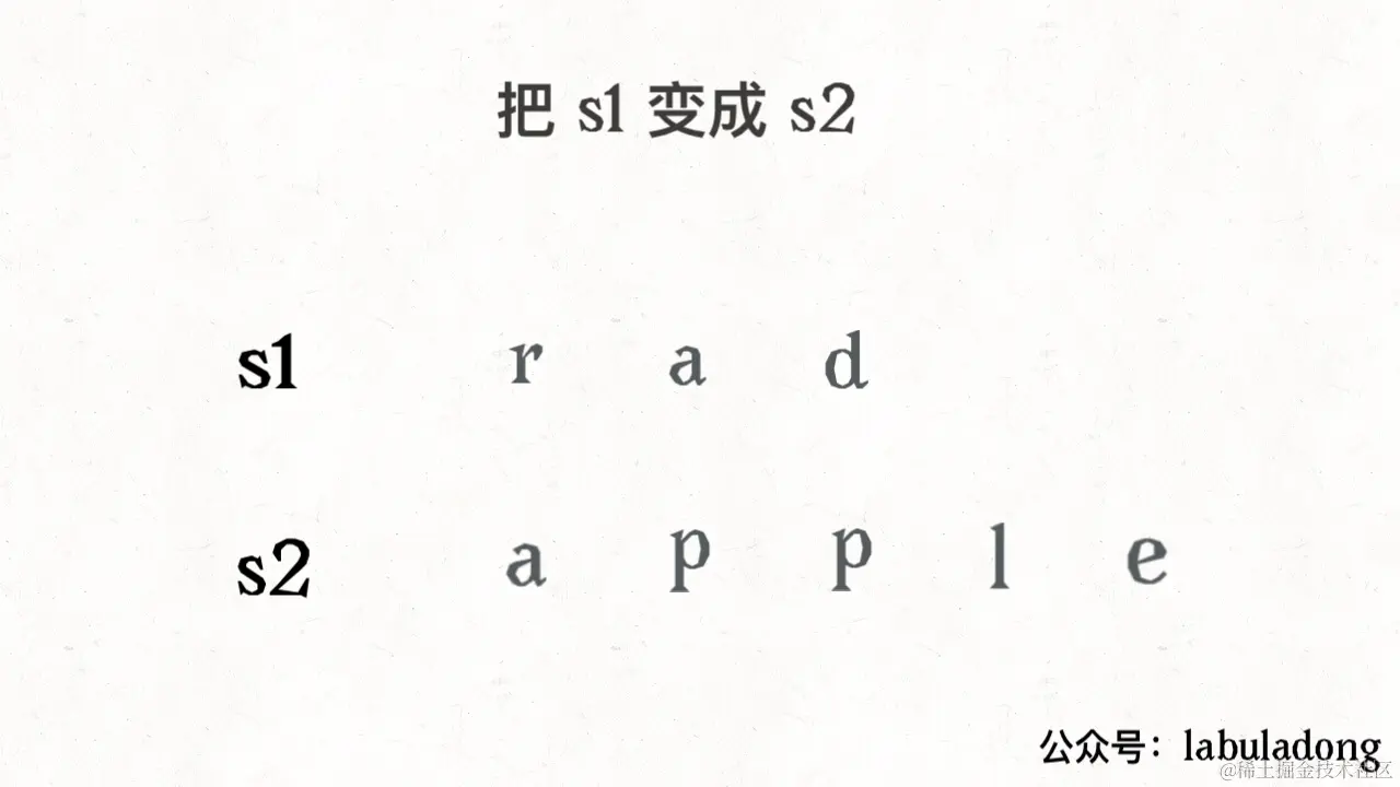 设两个字符串分别为 "rad" 和 "apple",为了把 s1 变成 s2,算法会这样进行: