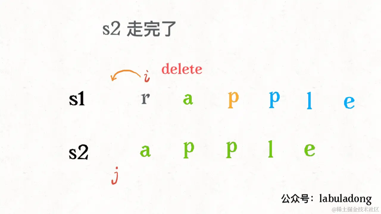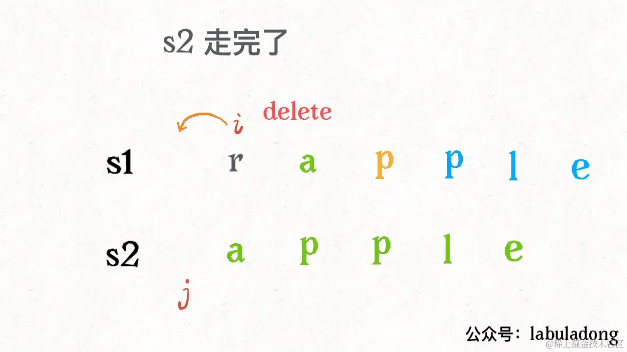 还有一个很容易处理的情况,就是 j 走完 s2 时,如果 i 还没走完 s1,那么只能用删除操作把 s1 缩短为 s2。比如这个情况: