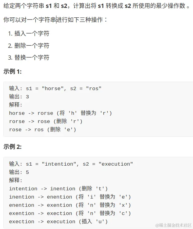 编辑距离问题就是给我们两个字符串 s1 和 s2,只能用三种操作,让我们把 s1 变成 s2,求最少的操作数。需要明确的是,不管是把 s1 变成 s2 还是反过来,结果都是一样的,所以后文就以 s1 变成 s2 举例。