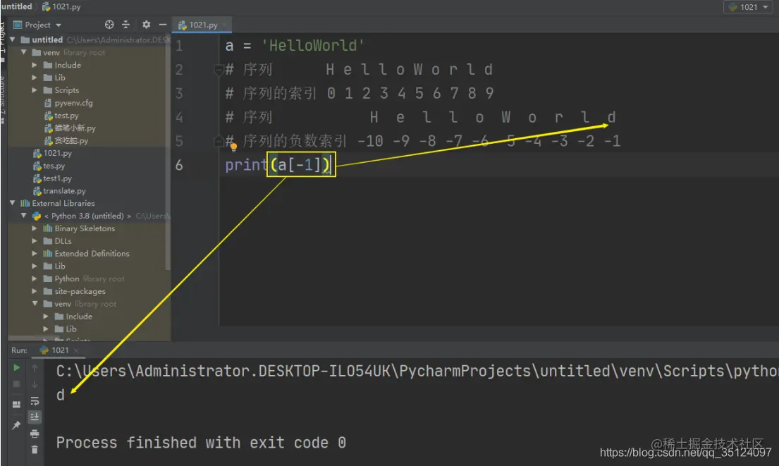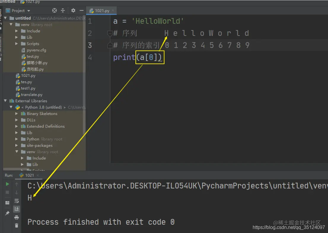 字符串是由字符组成的序列,索引0指向第一个元素,以此类推。操作如下图所示: