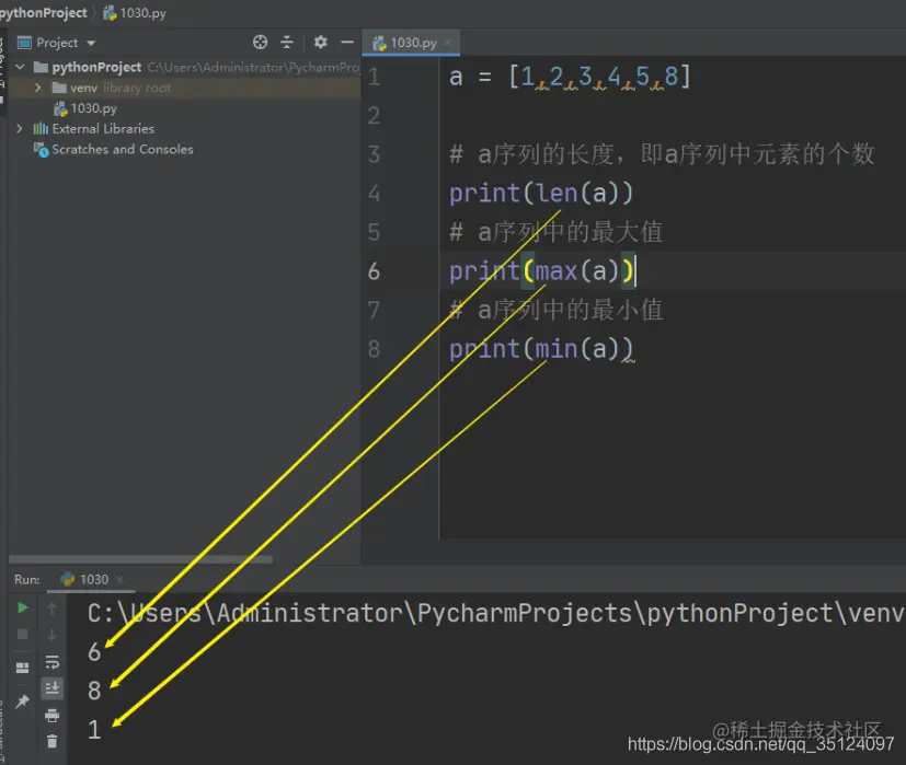 作为序列的属性值,Python提供了长度、最大值和最小值的内建函数来使用。对应的函数名称是len、max和min。长度是指序列中元素的个数、最大值和最小值函数的参数是以序列中多个数字作为参数,求取这些数字中的最大值和最小值。操作如下图所示: