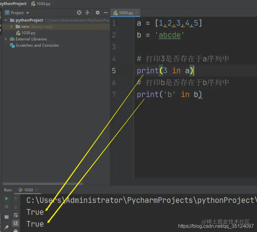 判断某个字符或者某个数字是否存在于序列中,使用in运算符,如果存在于序列当中,返回结果为True;如果不存在于序列当中,返回结果为False。操作结果如下图所示: