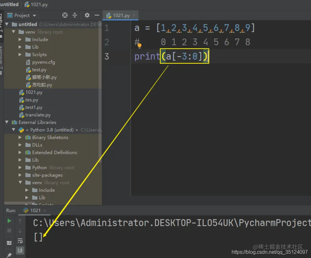 这个输出和预期并不一致,不但没有数值,只是输出了一个空的序列。这是因为只要在分片中最左边的索引比它右边的索引晚出现在序列中,结果就是一个空的序列。在序列中,索引值-3代表倒数第3个元素,0代表的是第一个元素,倒数第3个元素比第1个元素晚出现,即排在第1个元素后面,所以得到的结果是空序列。
