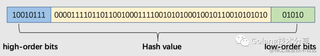 map中的数据被存放于一个数组中的,数组的元素是桶(bucket),每个桶至多包含8个键值对数据。**哈希值低位(low-order bits)用于选择桶,哈希值高位(high-order bits)用于在一个独立的桶中区别出键。**哈希值高低位示意图如下