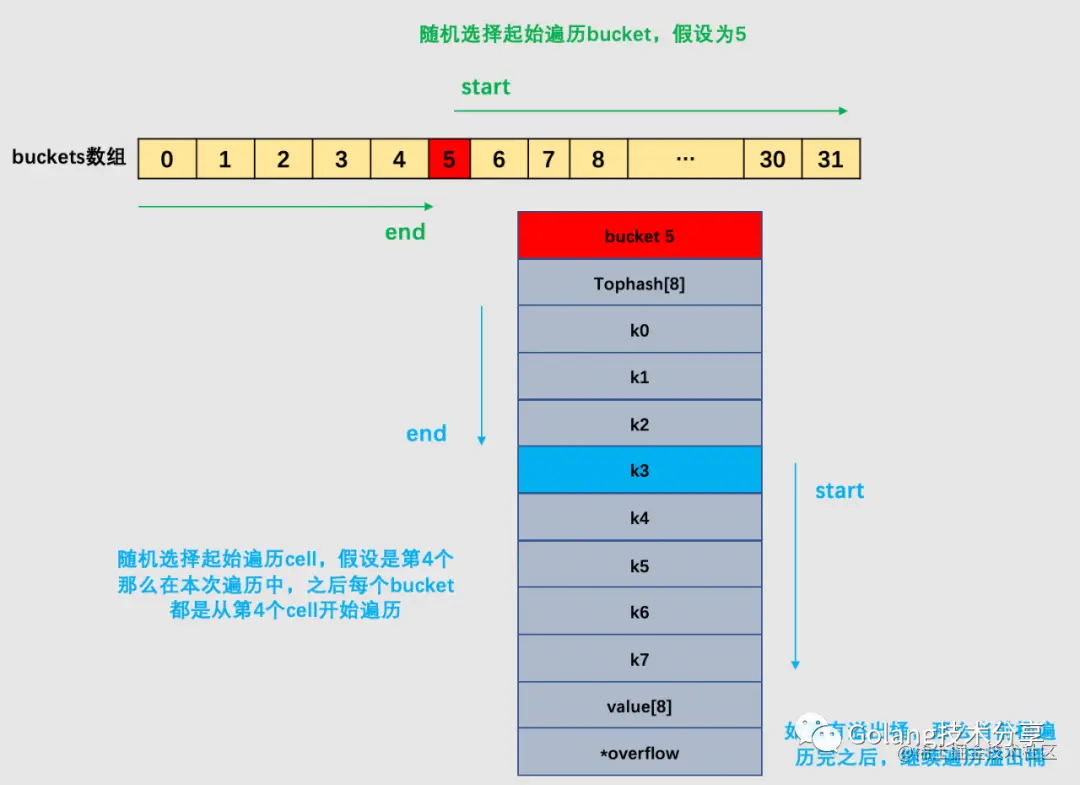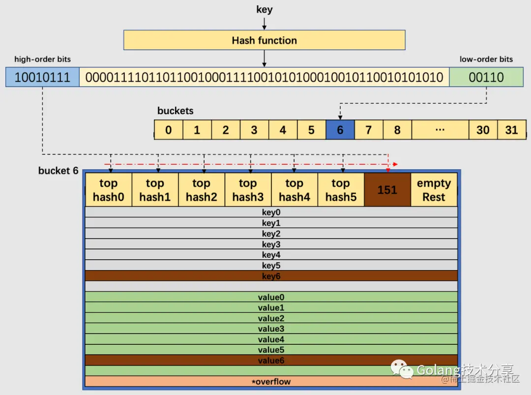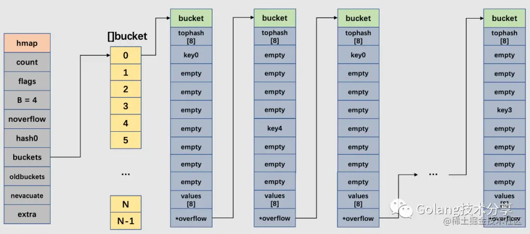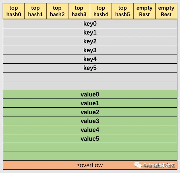 在以上图解示例中,该桶的第7位cell和第8位cell还未有对应键值对。需要注意的是,key和value是各自存储起来的,并非想象中的key/value/key/value...的形式。这样做虽然会让代码组织稍显复杂,但是它的好处是能让我们消除例如map[int64]int所需要的填充(padding)。此外,在8个键值对数据后面有一个overflow指针,因为桶中最多只能装8个键值对,如果有多余的键值对落到了当前桶,那么就需要再构建一个桶(称为溢出桶),通过overflow指针链接起来。