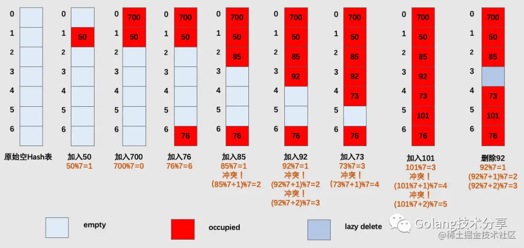 其中,empty代表槽位为空,occupied代表槽位已被占(后续映射到该槽,则需要线性向下继续探测),而lazy delete则代表将槽位里面的数据清除,并不释放存储空间。