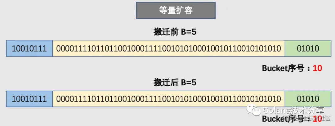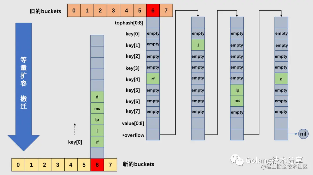 以6号桶为例,它有一个bucket和3个overflow buckets,但是我们能够发现桶里的数据非常稀疏,等量扩容的目的就是为了把松散的键值对重新排列一次,以使bucket的使用率更高,进而保证更快的存取。搬迁完毕后,新的6号桶中只有一个基础bucket,暂时并不需要溢出桶。这样,和原6号桶相比,数据变得紧密,使后续的数据存取变快。