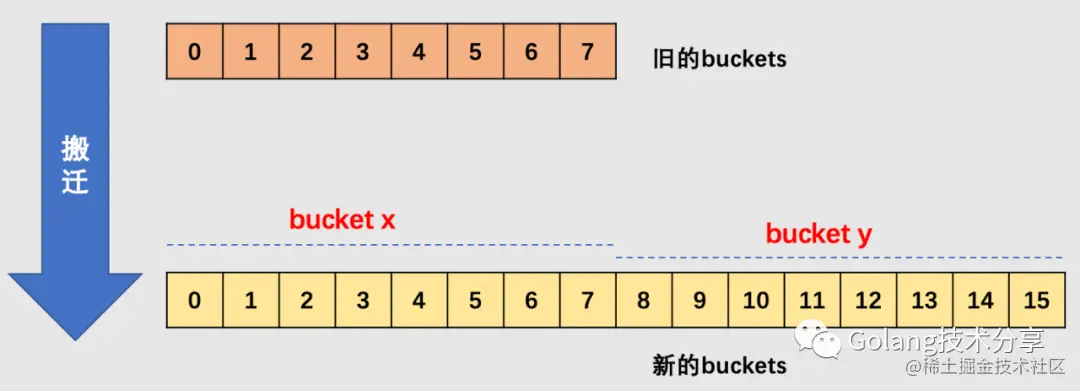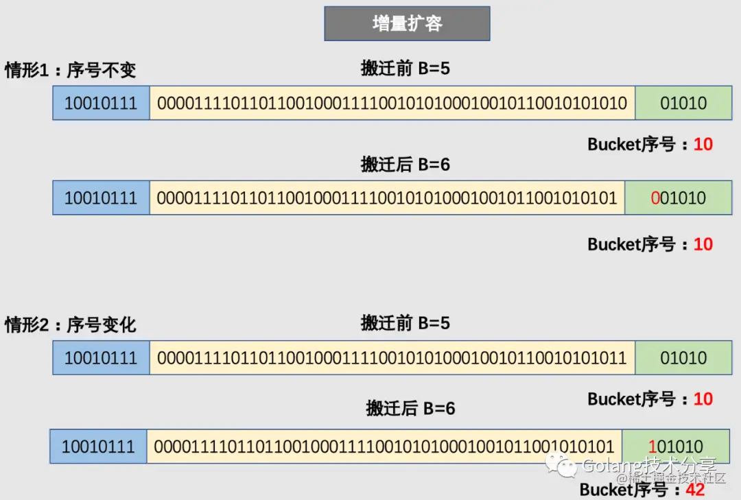 最后回答一下上文中留下的问题:为什么确定key落在哪个区间很重要?因为对于增量扩容而言,原本一个bucket中的key会被分裂到两个bucket中去,它们分别处于bucket x和bucket y中,但是它们之间存在关系 bucket x + 2^B = bucket y (其中,B是老bucket对应的B值)。假设key所在的老bucket序号为n,那么如果key落在新的bucket x,则它应该置入 bucket x起始位置 + n*bucket 的内存中去;如果key落在新的bucket y,则它应该置入 bucket y起始位置 + n*bucket的内存中去。因此,确定key落在哪个区间,这样就很方便进行内存地址计算,快速找到key应该插入的内存地址。