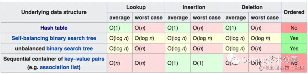 可以看到,对于元素查找而言,二叉搜索树的平均和最坏效率都是O(log n),哈希表实现的平均效率是O(1),但最坏情况下能达到O(n),不过如果哈希表设计优秀,最坏情况基本不会出现(所以,读者不想知道Go是如何设计的Map吗)。另外二叉搜索树返回的key是有序的,而哈希表则是乱序。