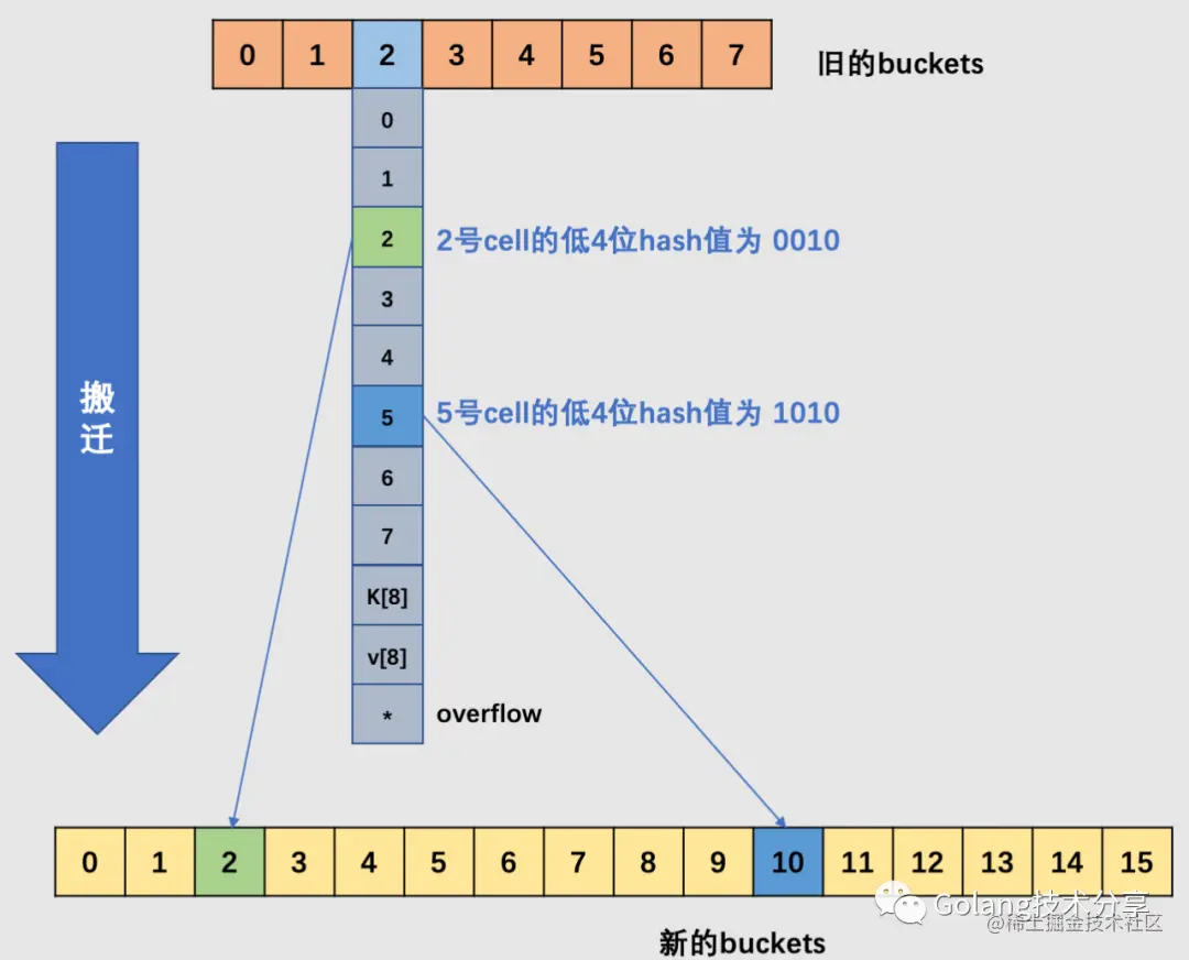 // 如果目的地的桶已经装满了(8个cell),那么需要新建一个溢出桶,继续搬迁到溢出桶上去。
