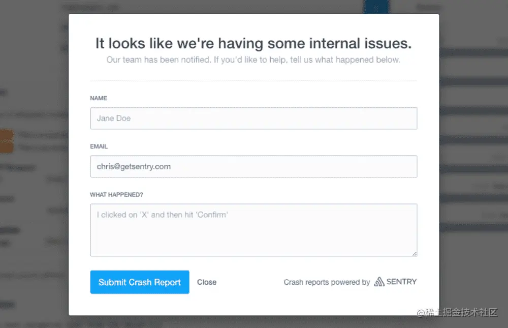 当用户遇到错误时,Sentry 可以收集其他反馈。当您通常可以呈现简单的错误页面(经典的 500.html)时,这种类型的反馈很有用。