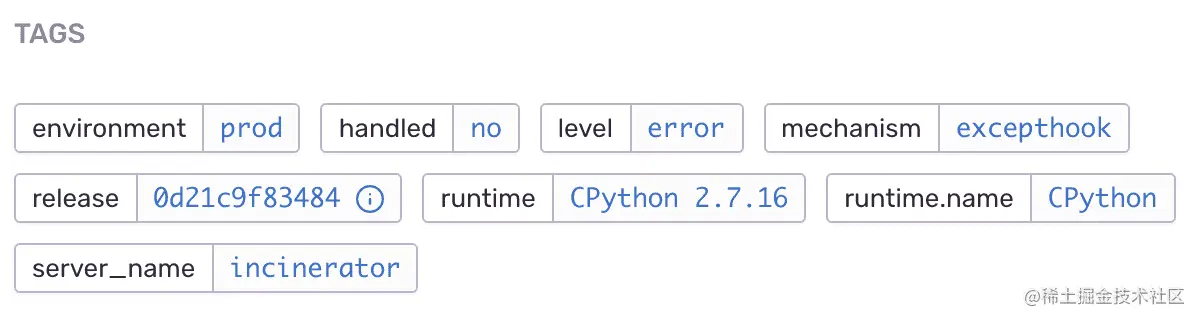 我们将自动为一个事件的所有标签建立索引,以及 Sentry 看到标签的频率和最后一次。 我们还将跟踪不同标签的数量,并可以帮助您确定各种问题的热点。