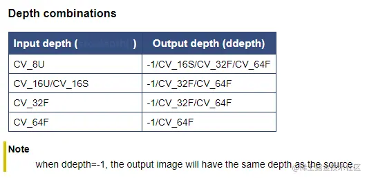 参数三:ddepth,输出图像的数据类型(深度),根据输入图像的数据类型不同拥有不同的取值范围。当赋值为-1时,输出图像的数据类型自动选择。