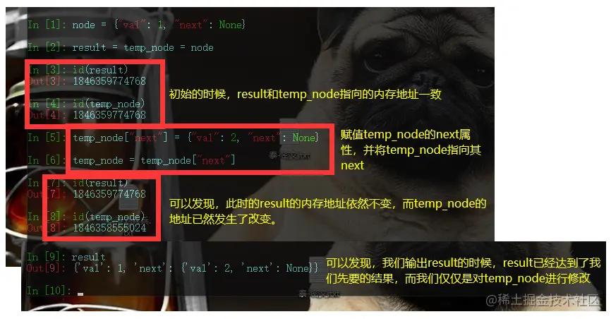 这主要是因为,我们初始化创建的result已经和temp_node都赋值给新的链表了,其中val为0,next属性值为None,其内存位置是固定的。而初试的result和temp_node是相等的,所指向的内存地址是一样的,所以我们只需要的延伸temp_node节点即可,而result地址不变,而result指向的下一个节点的地址则会随着temp_node的变化而变化。