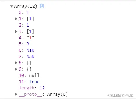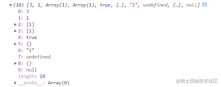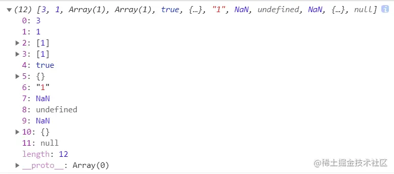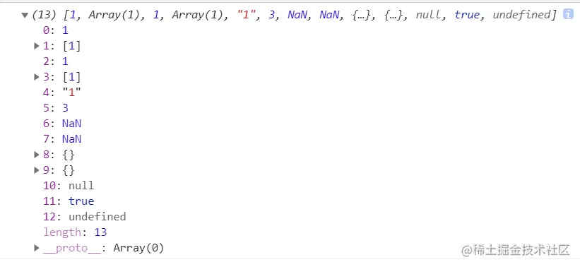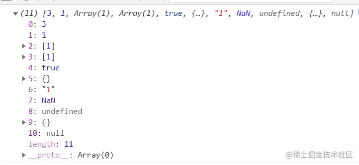 let arr1 = [3, 1, [1], 1, [1], true, true, {}, '1', NaN, undefined, NaN, undefined, {}, null, null];