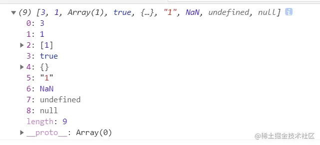 arr1:[3, 1, [1], true, {}, '1', NaN, undefined, null],length = 9。
