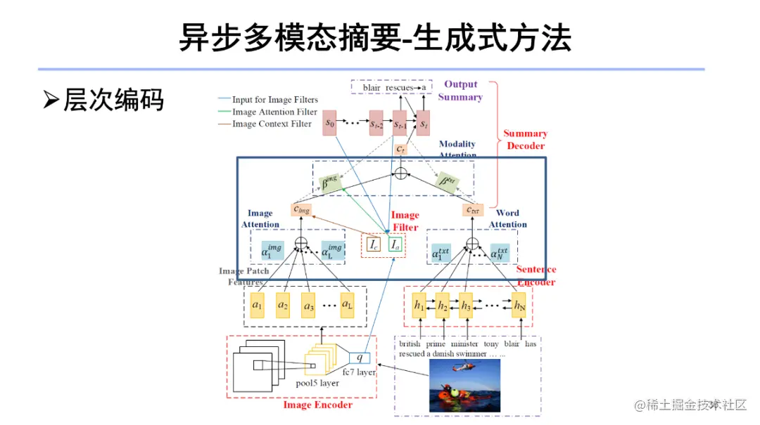 在本次研讨会中,来自中科院自动化所的研究员张家俊老师,为大家介绍其所在的课题组近年来在多模态摘要方法和评价等方面的研究进展。张老师重点介绍了异源多模态摘要生成的研究方法变迁:从抽取式方法到生成式方法,再到目前融入多模态注意力机制的图文式摘要生成方法等。同时,张老师也介绍了多模态自动摘要的自动评价方法: 综合考虑文本和图片重要性以及文本图片相关性更加贴近人工打分。