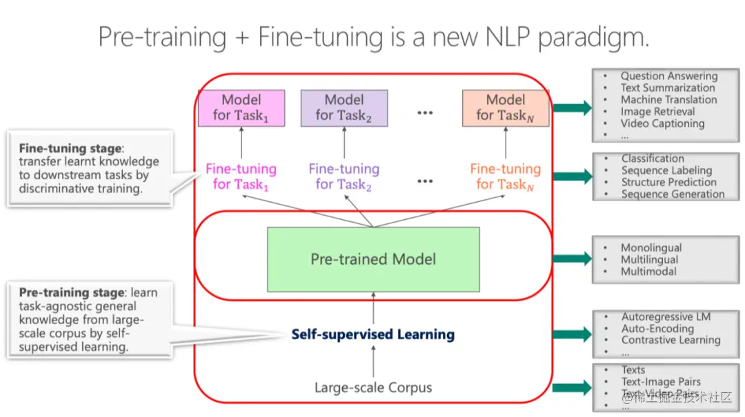 预训练模型的出现,使自然语言处理由原来的手工调参、依靠机器学习专家的阶段,进入到可以大规模、可复制的大工业施展阶段。此阶段基于预训练模型+微调机制,具备很高的可扩展性,展现出很高潜力。而当前研究也从单一语言扩展到多模态。
