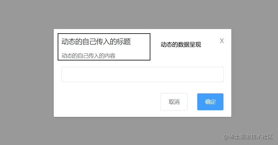 - 功能一点击关闭按钮时弹框消失;功能二:点击取消按钮时弹框消失;功能三:点击确定按钮时弹框消失并出现输入框的文字