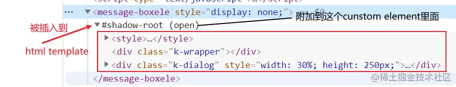 MessageBoxEles.width=this.opts.width;触发了上文中自定义命名组件MessageBoxeles中的set width(newValue){this._shadowRoot.querySelector(".k-dialog").style.width = newValue;}该方法,并成功了根据用户传入的配置渲染出了动态数据。
