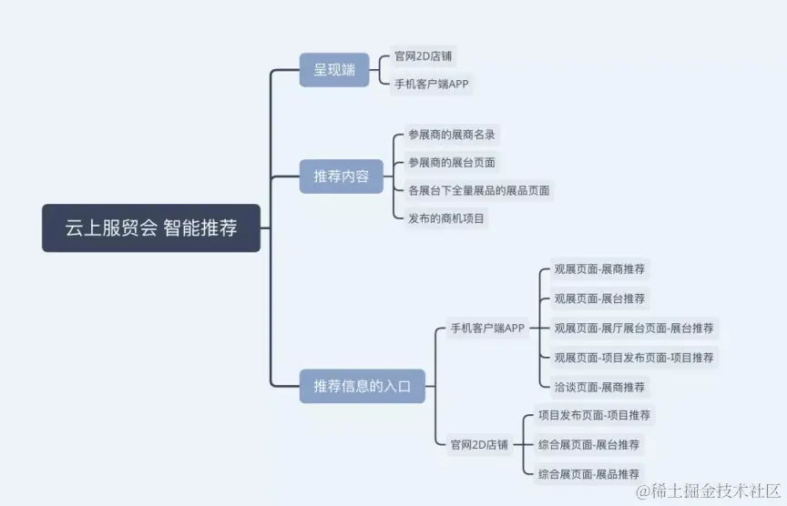 我们常见的有新闻推荐和电商场景的商品推荐,展会场景推荐系统与之不同的是,它需要满足参展商、采购商和个人用户各方需求,尤其是像前不久举办的永不落幕的云上服贸会,首次采用线上+线下结合的模式,将服贸会影响辐射周期从集中的一周拉长至一整年,参展商、采购商以及正在寻找商机有需求的个人用户都可以随时随地浏览云上服贸会寻找有价值的商机。