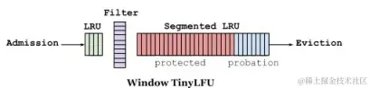 具体做法是:首先Window TinyLFU维护了一个近期访问记录的频次信息,作为一个过滤器,当新记录来时,只有满足TinyLFU要求的记录才可以被插入缓存。为了解决资源的高消耗问题,它通过4-bit CountMinSketch实现,这个算法类似于布隆过滤器,可以用很小的空间来存放大量的访问频次数据。这个设计给予每个数据项积累热度的机会,而不是立即过滤掉。这避免了持续的未命中,特别是在突然流量暴涨的的场景中,一些短暂的重复流量就不会被长期保留。为了刷新历史数据,一个时间衰减进程被周期性或增量的执行,给所有计数器减半。