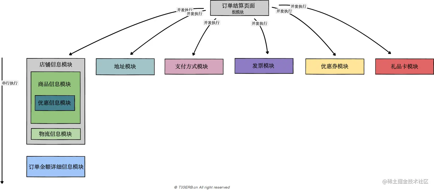 如果把上面不存在依赖关系的模块修改为并发的执行,则我们得到如下的执行流程: