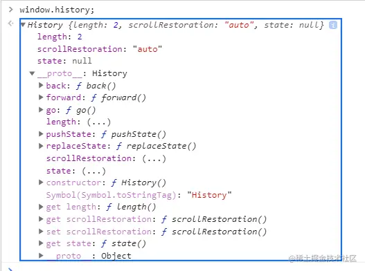 所有浏览器都支持 History API。在 window.history 对象及其原型上有一些可用的方法,接下来将展示这些方法。它还包含用户访问的所有网站记录。打开浏览器控制台来查看这个对象。请看下面的示例: