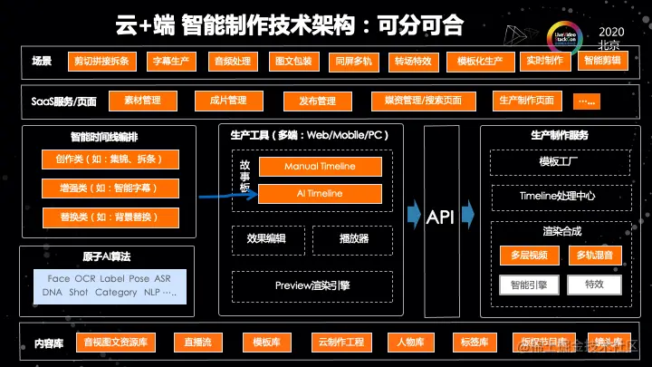 最左边的这一块实际上是我们后来加上的,在开始我们做第一版的时候,是没有 AI 部分的。把 AI 的这个部分加上来,是为了能够智能的对时间线做一个编排。对时间线的编排,我们把它抽象成了三个场景。