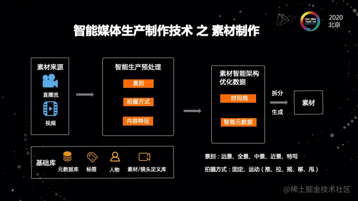 并且,我可能会根据我重复使用的一些原则和基准来去做我的挑选策略。我的素材源还是两类,大概分成两类,直播流和视频。然后经过视频智能生产的一个预处理,可以看到这个关注点跟原来成片制作是完全不同的。