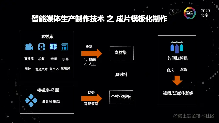 我们通过两个部分的结合,就是从海量的素材库去搜索到每次制作需要的这个素材集,并且用AI的方式去把一个模板能够裂变成个性化的模板。之后,我们把这个模板和素材集然后去结合。这个就是我们的原材料。最终我们通过这样一个结合去构建时间线。