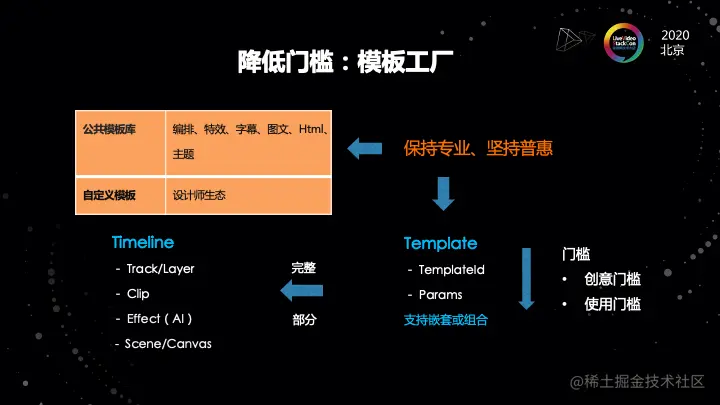 这样可以最大的利用模板的成果转化。这个模板工厂它核心解决的问题是:降低了使用时间线的门槛。同时还有一个最重要的,解决了制作创意的门槛。这两个设计为整个制作领域的专业度的提供保障。