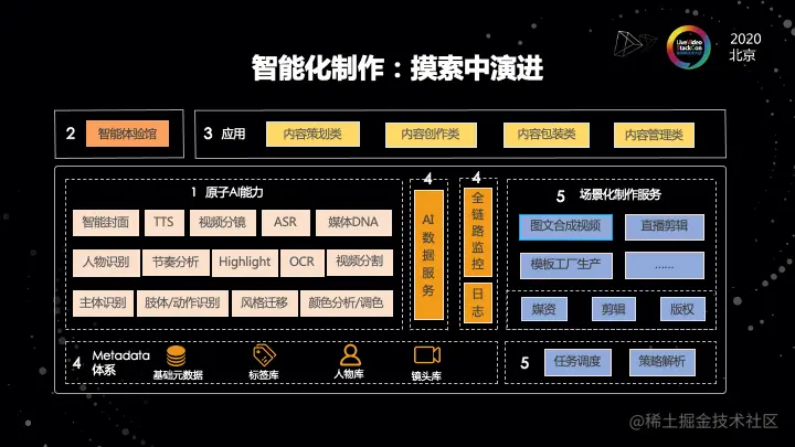 在整个过程中,我们会依赖像媒资系统,像剪辑系统,像版权系统,做一些任务的调度和策略的解析。然后把不同场景的服务去使用不同的策略去实现。所以,可以看到我们整个视频云在智能化的制作过程中,它不是一个凭空想象的过程。AI 的能力,是需要跟场景结合起来,才能真正的为客户提供服务的。