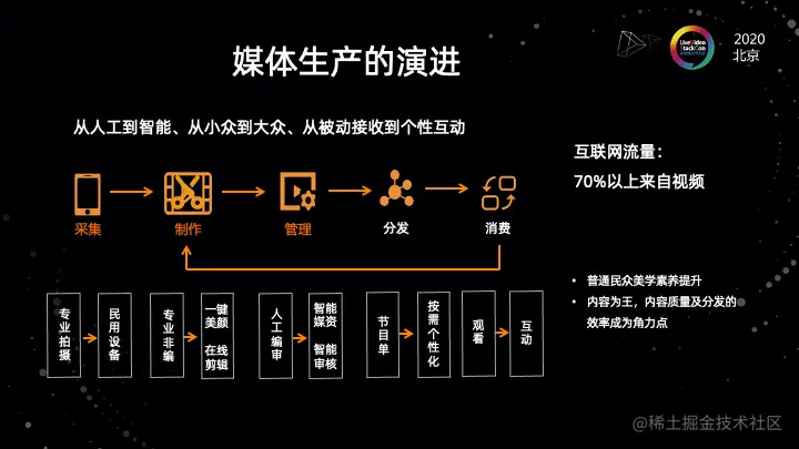 以前到现在,过去这么多年,视频技术在整个行业发展了好几十年。在整个环节的流转当中,视频全链路的每一个环节以前跟现在都发生了很大的变化。