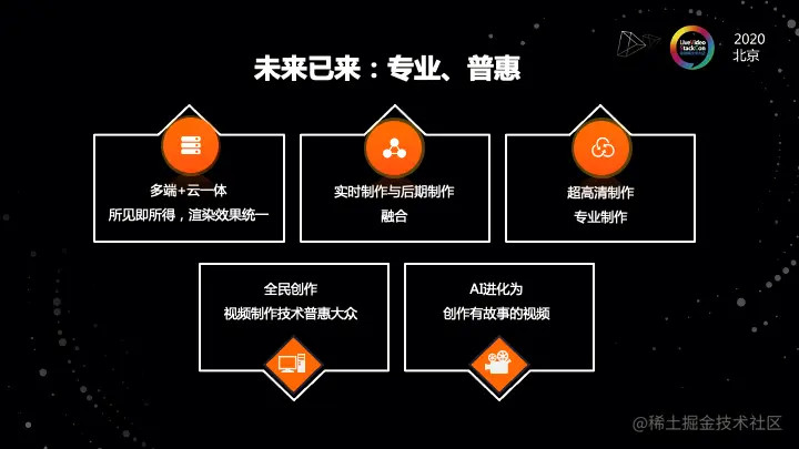 这个是我们整体对这个未来的看法。那具体到点的话,我们认为,首先第一个当我们端跟云协同制作的时候,会有一个所见即所得,但是渲染效果不统一的问题。我们希望未来的话,端上的制作和云端的制作,它的效果是一致的。这是未来的一个趋势。这里可能会用到云渲染的技术。现在的实时制作和后期制作相对是割裂的。我们希望未来这两个部分是能够完全融合的。