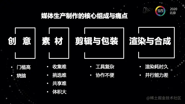 在讲这个架构设计之前,我想先给大家分享一下我们之前所分析的一些媒体市场制作的核心组成和核心痛点。在媒体生产制作的过程当中,我们可以把整个的制作过程抽象成四个阶段。