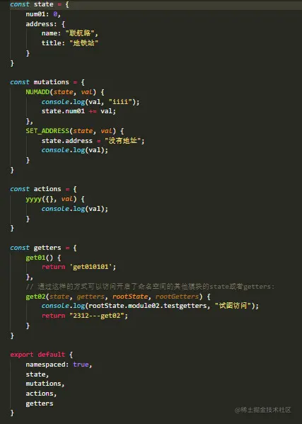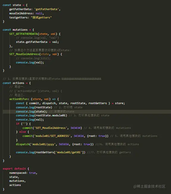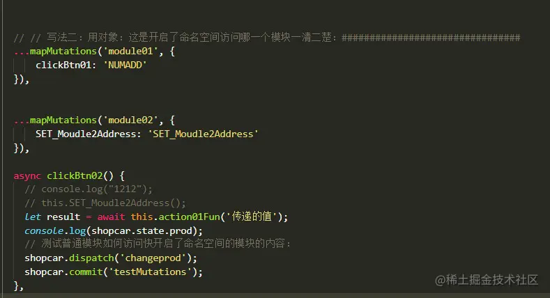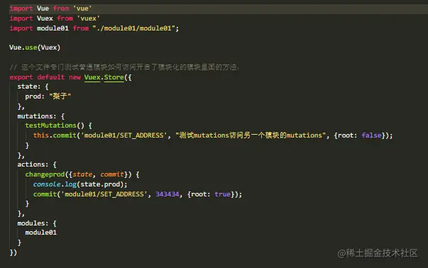- 如果你有这样的需求,在一个普通的store里面想要访问开启了命名空间的模块,你可以将想要访问的这个模块引入到当前普通store里面,写法如下: