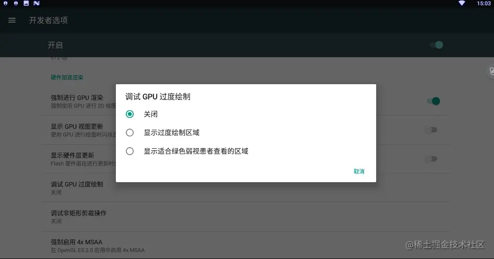 Android设置中心->开发中选项->调试GPU过度绘制->现实过度绘制区域