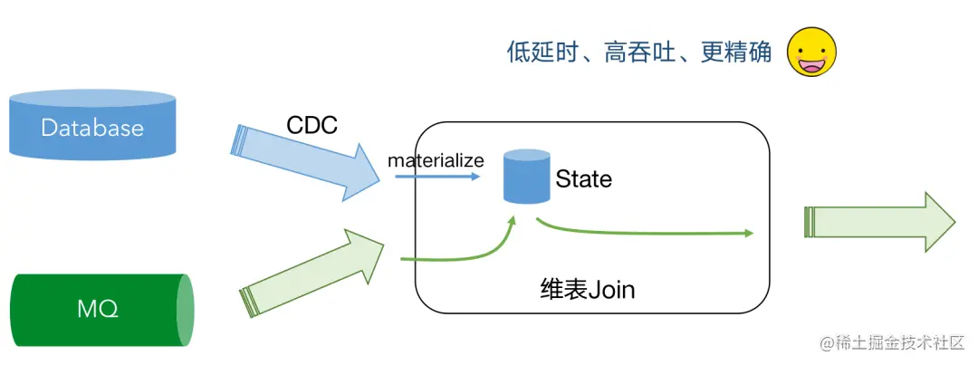 我们可以通过 CDC 把维表的数据导入到维表 Join 的状态里面,在这个 State 里面因为它是一个分布式的 State ,里面保存了 Database 里面实时的数据库维表镜像,当消息队列数据过来时候无需再次查询远程的数据库了,直接查询本地磁盘的 State ,避免了 IO 操作,实现了低延迟、高吞吐,更精准。