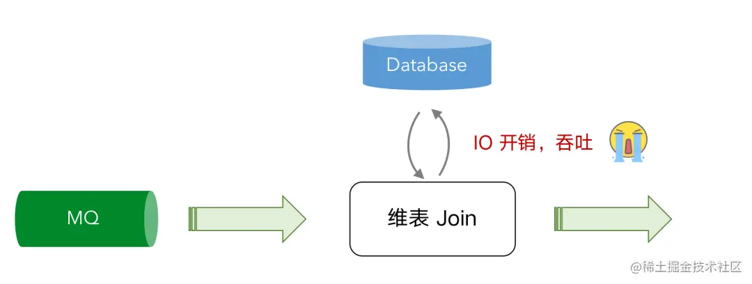 目前维表查询的方式主要是通过 Join 的方式,数据从消息队列进来后通过向数据库发起 IO 的请求,由数据库把结果返回后合并再输出到下游,但是这个过程无可避免的产生了 IO 和网络通信的消耗,导致吞吐量无法进一步提升,就算使用一些缓存机制,但是因为缓存更新不及时可能会导致精确性也没那么高。