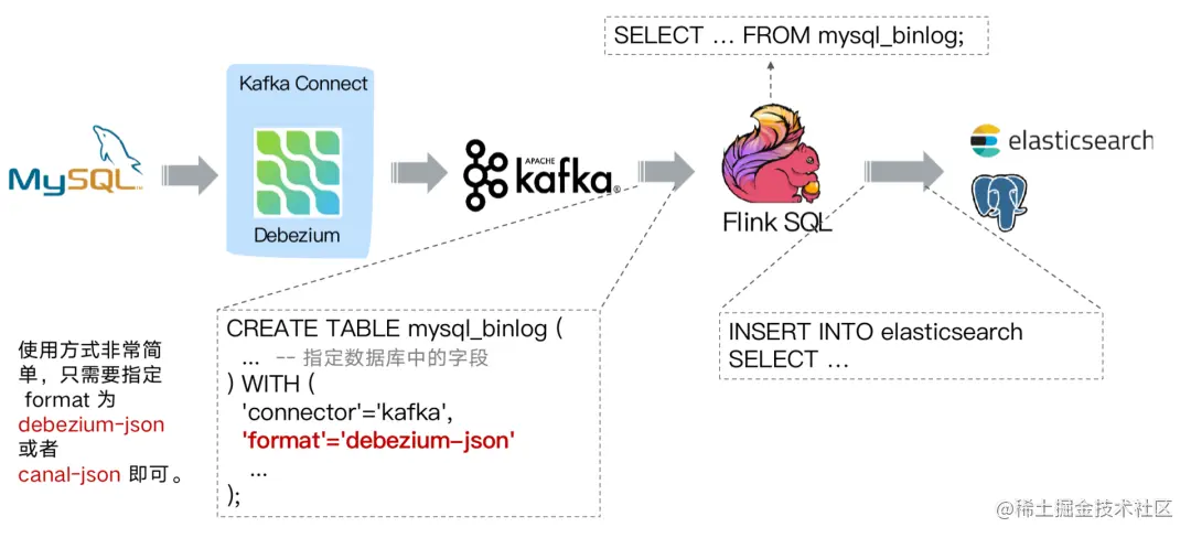 通过 Debezium 订阅业务库 MySQL 的 Binlog 传输至 Kafka ,Flink 通过创建 Kafka 表指定 format 格式为 debezium-json ,然后通过 Flink 进行计算后或者直接插入到其他外部数据存储系统,例如图中的 Elasticsearch 和 PostgreSQL。