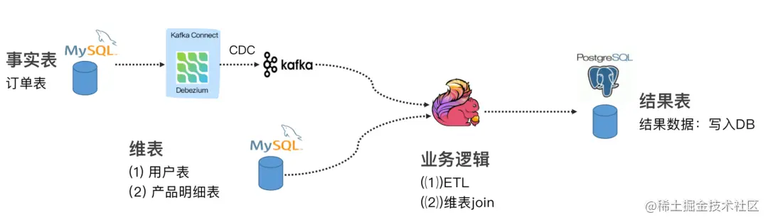 这个案例通过订阅我们订单表(事实表)数据,通过 Debezium 将 MySQL Binlog 发送至 Kafka,通过维表 Join 和 ETL 操作把结果输出至下游的 PG 数据库。具体可以参考 Flink 公众号文章:《Flink JDBC Connector:Flink 与数据库集成最佳实践》案例进行实践操作。