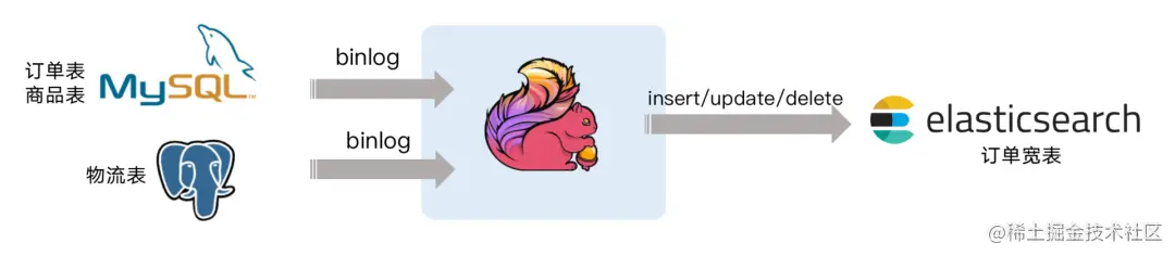 模拟电商公司的订单表和物流表,需要对订单数据进行统计分析,对于不同的信息需要进行关联后续形成订单的大宽表后,交给下游的业务方使用 ES 做数据分析,这个案例演示了如何只依赖 Flink 不依赖其他组件,借助 Flink 强大的计算能力实时把 Binlog 的数据流关联一次并同步至 ES 。