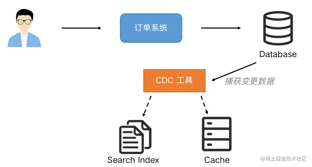 很明显这种模式是不可持续发展的,这种双写到各个数据存储系统中可能导致不可维护和扩展,数据一致性问题等,需要引入分布式事务,成本和复杂度也随之增加。我们可以通过 CDC(Change Data Capture)工具进行解除耦合,同步到下游需要同步的存储系统。通过这种方式提高系统的稳健性,也方便后续的维护。
